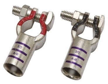 US made crimped polarized battery clamp terminals offer environmental protection when used with TYCO DWP-125 epoxy lined heat shrink. Clamp design allows bolt orientation either direction.