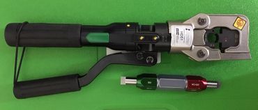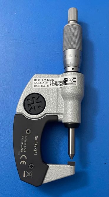 Periodic crimper service checks performed with a Mitutoyo 342-271 crimp depth micrometer and go/nogo gauges.